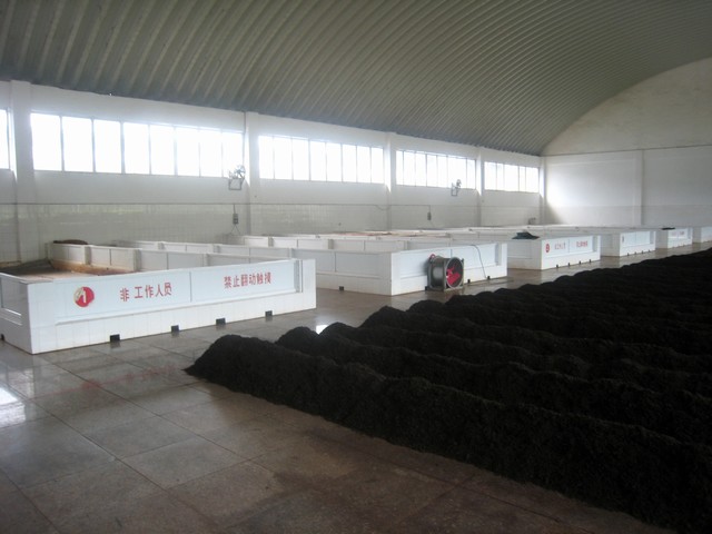 熟茶起堆一般是同級發酵,就是芽茶、三到五級、七到九級這幾種等級的茶葉是分別起堆發酵的。一個堆子需茶九到十二噸。一次完整的發酵周期視所需發酵度狀況,正常約時間四至六周,現代改良技術則約需時八周到十二周之間。發酵時需不停地檢查堆溫、翻堆、灑水。。。。。。總之發酵車間內溫度高、濕度高,是一個很折磨人的地方。