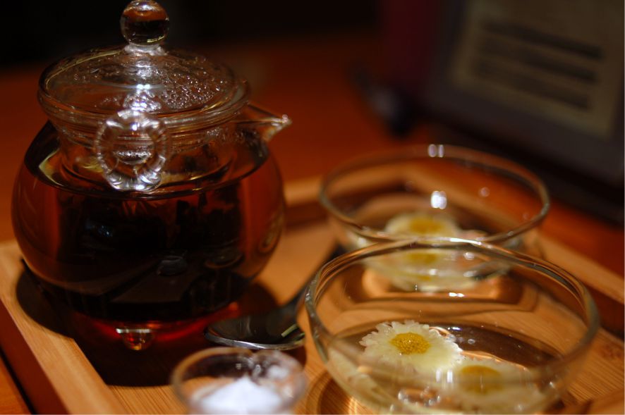 用普洱茶葉和貢菊,一起沖泡,口感清爽。菊花清熱解毒,普洱茶性溫和,兩者同時飲用,性能調和功效倍增。值得一提的是:菊花普洱茶尤其適合熱性體質的茶人朋友!